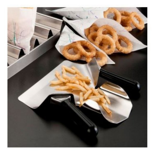 Paletta per patatine in acciaio inox. Resistente con comode maniglie. Questa paletta è perfetta per aiutarti a mettere le patatine o i tuoi fritti all'interno del sacchetto.
