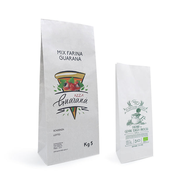 Sacchetti per farina in carta bianca per alimenti. I formati dal 5 al 20 kg sono realizzati in carta doppia, carta esterna bianca, interna avana, per una maggiore resistenza. Sacchi farina ideali per farine, cereali, mangimi, personalizzabili con stampa digitale in quadricromia.