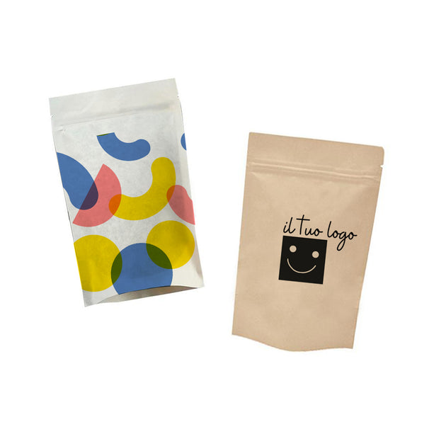- Sacchetto in carta chiusura a zip personalizzabile con etichetta.
