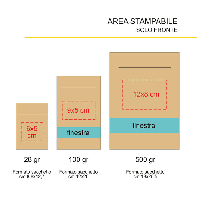 Sacchetti zip in carta avana interno argentato, idoneo al contatto diretto con alimenti. Il sacchetto zip termosaldabile può essere personalizzato con la tua grafica fino a 4 colori nella parte frontale. Ogni formato proposto ha un'area di stampa definita che potrai visualizzare nelle foto presenti in questa scheda.
