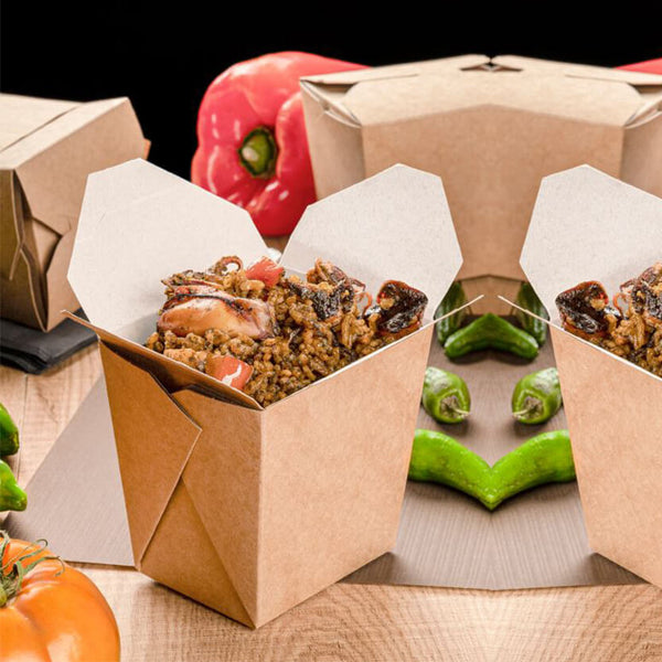 Contenitori in cartoncino kraft avana ideali per la consegna a domicilio e l’asporto.