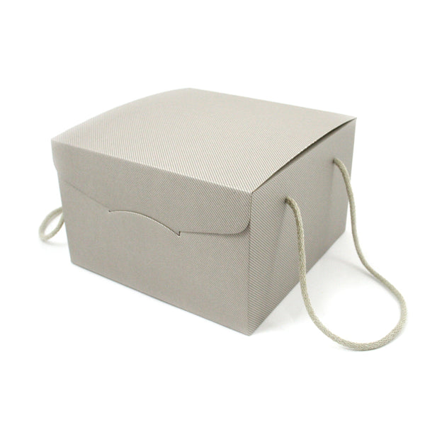 Scatola panettone con manici in cordino di cotone, cartone grigio con righe bianche. Perfetta come scatola regalo.