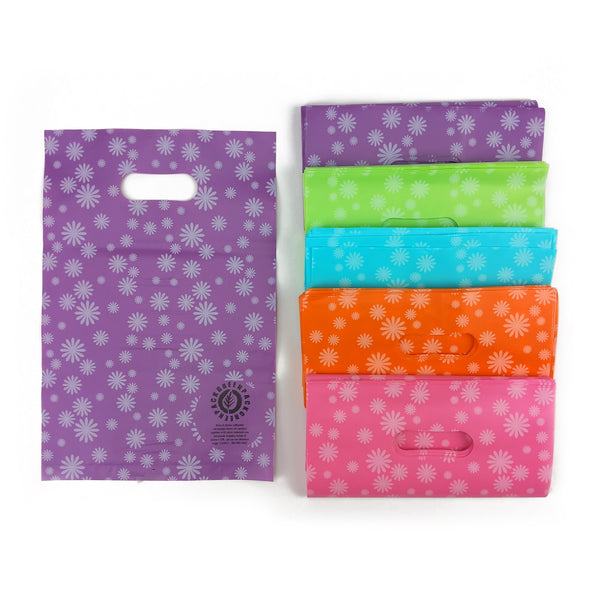 Sacchetti manico fagiolo in confezione colori assortiti e stampa fiorellini bianchi. Shopper in plastica riciclata greenpack spessore 60 micron, perfetta come confezione per negozi. Confezione colori assortiti: viola, verde, azzurro, arancione e rosa (20 pz a colore).