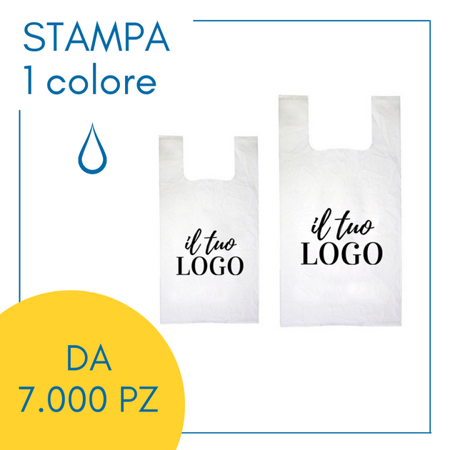 Shopper compostabili personalizzate. Classico modello di shopper con manico bretella perfette per supermarket, negozi, pescherie, macellerie, pasta fresca. Le shopper sono personalizzabili con il tuo logo fino a massimo 2 colori.