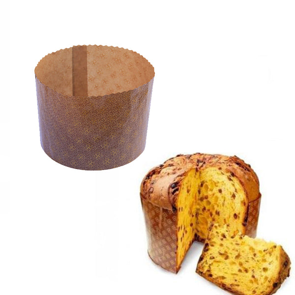 Stampo per panettone modello alto in carta di pura cellulosa colore marrone per alimenti. Lo stampo in carta può essere utilizzato in forno tradizionale a max 220° in base al tipo di impasto. Stampi disponibili in tutta la gamma dal mini panettone da 100 grammi al formato più grande stampo panettone da 1 kg. Le misure indicano in ordine diametro della base e altezza dello stampo.
