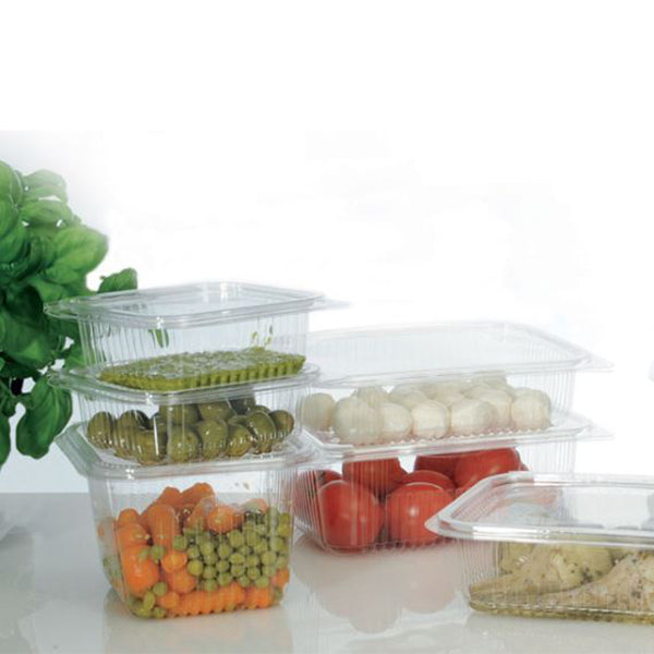 Vaschette trasparenti per alimenti. Contenitore in 100% OPS per alimenti (polietilene) con chiusira coperchio a cerniera, molto usato da gastronomie e alimentari per confezionare sughi, formaggi spalmabili, e cibi pronti. Questa vaschetta trasparente per alimenti ha la chiusura ermetica che consente l'utilizzo della vaschetta anche per contenere sugo o liquidi. Le misure indicano in ordine base, larghezza e altezza.