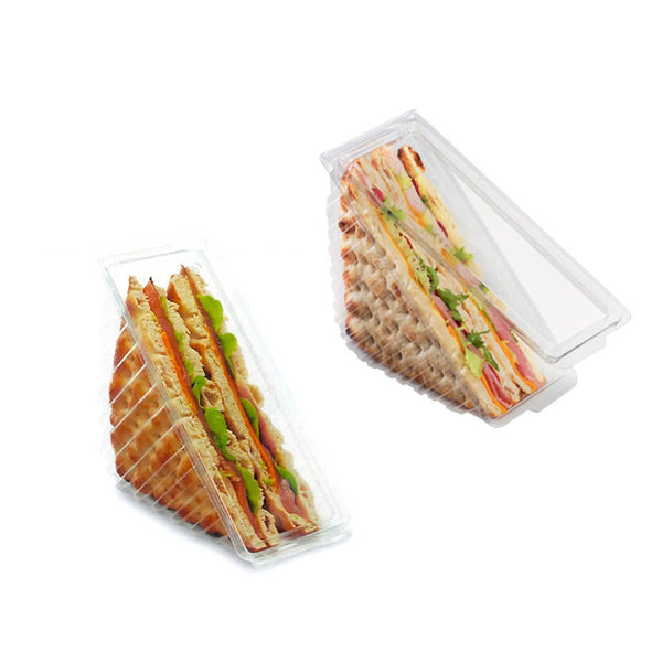 Vaschette per tramezzini trasparente con coperchio unito sono la soluzione perfetta per confezionare e presentare i tuoi sandwich ripieni. Realizzate in materiale trasparente di alta qualità, queste vaschette permettono una chiara visibilità del prodotto al loro interno. Il coperchio unito garantisce una chiusura rapida e sicura, mantenendo il contenuto fresco e protetto. Ogni vaschetta può contenere due tramezzini affiancati, offrendo un'opzione comoda per l'asporto o il catering.