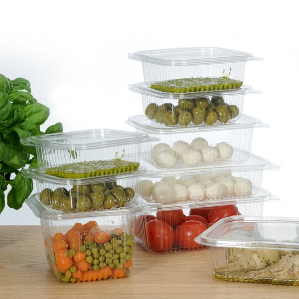 Vaschette trasparenti per alimenti. Contenitore in 100% OPS per alimenti (polietilene) con chiusura coperchio a cerniera ermetico, molto usato da gastronomie e alimentari per confezionare sughi, formaggi spalmabili, e cibi pronti. Questa vaschetta trasparente per alimenti ha la chiusura ermetica che consente l'utilizzo della vaschetta anche per contenere sughi o liquidi.